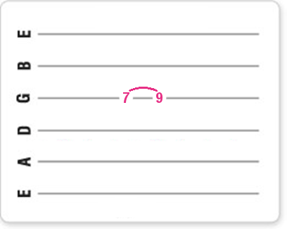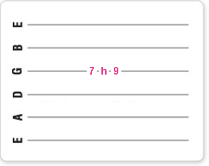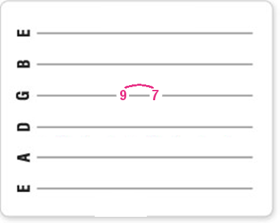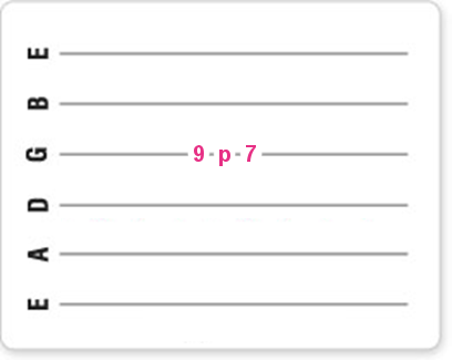 Je slaat dus de snaar op de normale manier aan met je ringvinger (3) op de negende fret, terwijl de wijsvinger (1) al klaarstaat op de zevende fret.